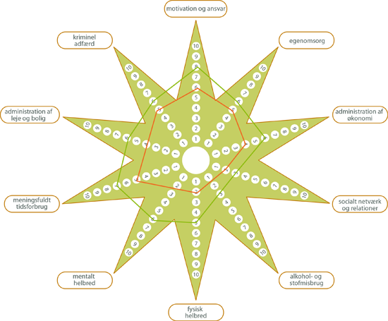 I den udfyldte Hjemløsestjerne som vises herover, repræsenterer den røde streg den første måling og den blå den nyeste måling.
